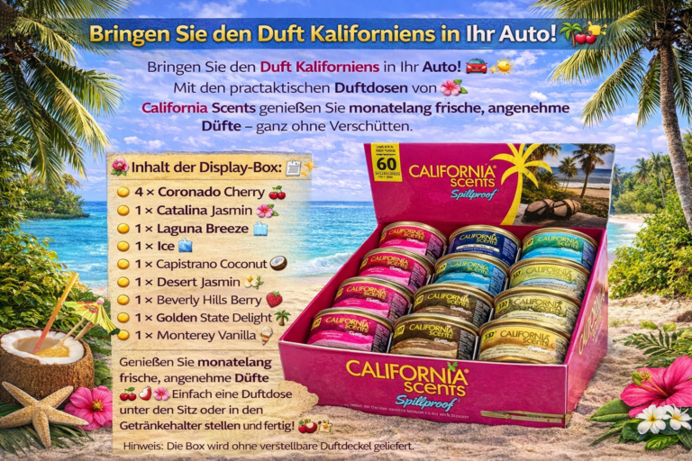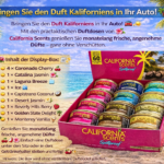 Bringen Sie den Duft Kaliforniens in Ihr Auto! Mit den praktischen Duftdosen von California Scents genießen Sie monatelang frische, angenehme Düfte – ganz ohne Verschütten. Einfach eine Dose öffnen und unter den Sitz oder in den Getränkehalter stellen.